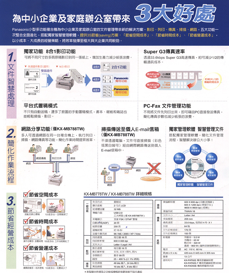 KX-MB778TW(A4平台式四合一) KX-MB788TW(A4平台式五合一)